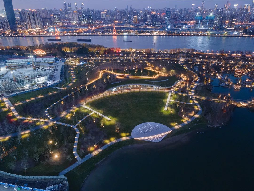 上海世博文化公園總體照明規(guī)劃以“和諧生態(tài)、人文雅趣、高效智能”為設(shè)計(jì)原則;在此基礎(chǔ)上,設(shè)計(jì)師以“月升月落,鏡中光華”為十一孔橋照明設(shè)計(jì)的創(chuàng)意理念,提取橋梁半圓形橋拱造型特征,借助燈光打亮后,會(huì)在水面倒映出完整的圓形,讓橋拱造型的變化在夜間更唯美、更靈動(dòng),仿佛月亮升起落下的動(dòng)態(tài)圖像,在一灣湖水處淺寫(xiě)守望。