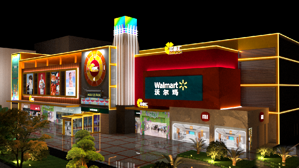 在具體方案中,設(shè)計(jì)團(tuán)隊(duì)采用 "分層布光、主次呼應(yīng)" 的策略:建筑主立面以 3000K 暖白光洗墻燈為基礎(chǔ),通過(guò)精準(zhǔn)的光束角控制,勾勒出簡(jiǎn)潔大氣的建筑輪廓,既凸顯了現(xiàn)代商業(yè)建筑的利落線(xiàn)條,又與沃爾瑪超市的溫馨消費(fèi)氛圍相適配;裙樓部分則創(chuàng)新采用暗藏式 LED 線(xiàn)條燈,沿商鋪招牌的邊緣有序排布,在夜間形成連貫的光影燈帶,既保證了商鋪標(biāo)識(shí)的清晰呈現(xiàn),又避免了強(qiáng)光對(duì)行人的視覺(jué)干擾。這種設(shè)計(jì)既尊重了建筑原有結(jié)構(gòu),又通過(guò)燈光層次的變化,讓建筑在夜色中呈現(xiàn)出 "遠(yuǎn)觀有輪廓,近賞有細(xì)節(jié)" 的視覺(jué)效果。