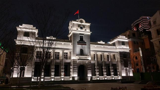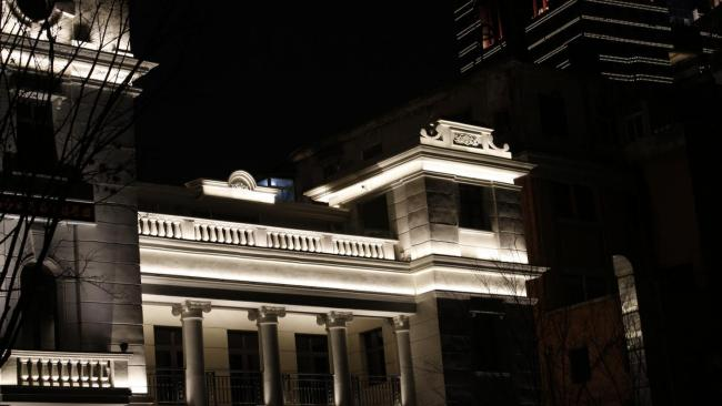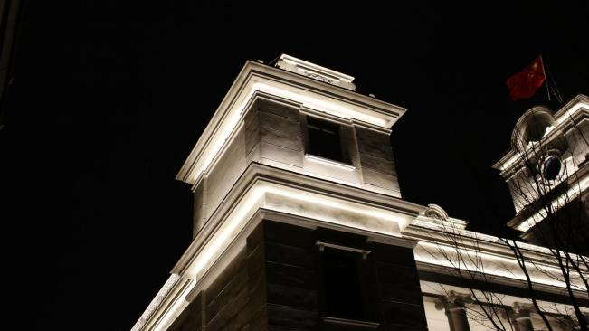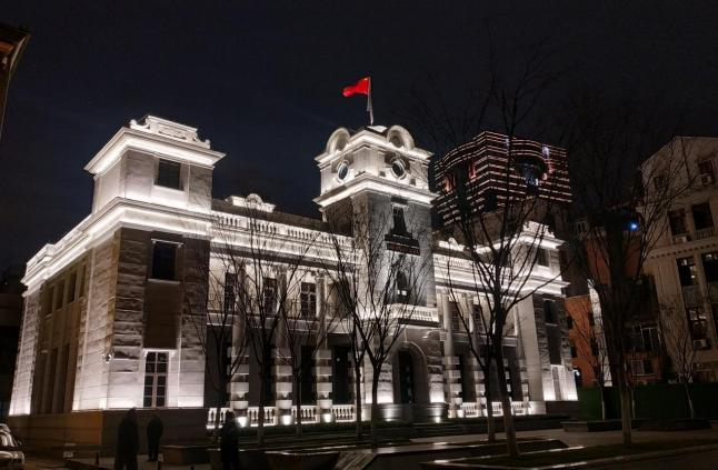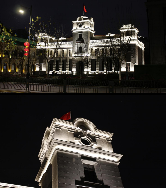 根據建筑自身特點,燈光布局明暗有序,層次分明,整體采用大面積泛光照明的手法,局部細節(jié)采用重點照明的手法,突出建筑細部節(jié)點構造,體現建筑獨特的美感。光影由下至上,層次豐富。樓頂的五星紅旗高高飄揚,在夜間燈光的輔助下,形成視覺焦點,光彩奪目,莊重神圣。