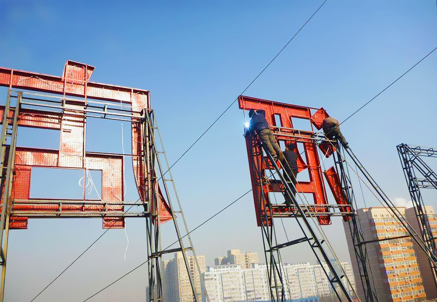 外露發(fā)光字由兩部分組成:一個金屬沖孔字,另一個是LED光源。發(fā)光字是由打好孔的字殼,和單色外漏燈組成。把整張的板材在機床上沖孔,再根據(jù)字形切割出來,焊好立體邊,打磨,烤漆處理,再把LED燈裝在沖好的孔上。 字形切割采用高精度等離子切割,立體邊使用專業(yè)的勾槽機勾角處理,并采用優(yōu)質汽車漆烤制而成。