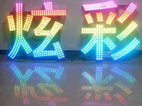 外露發(fā)光字,又稱沖孔發(fā)光字、穿孔發(fā)光字、燈珠字、外露led發(fā)光字、全彩led發(fā)光字等。是指在不銹鋼字、鋁字、鐵皮字等表面上沖孔裝上LED防水燈串。燈串顏色分為單色燈、七彩燈和全彩燈。常用于樓頂大字、門頭招牌。